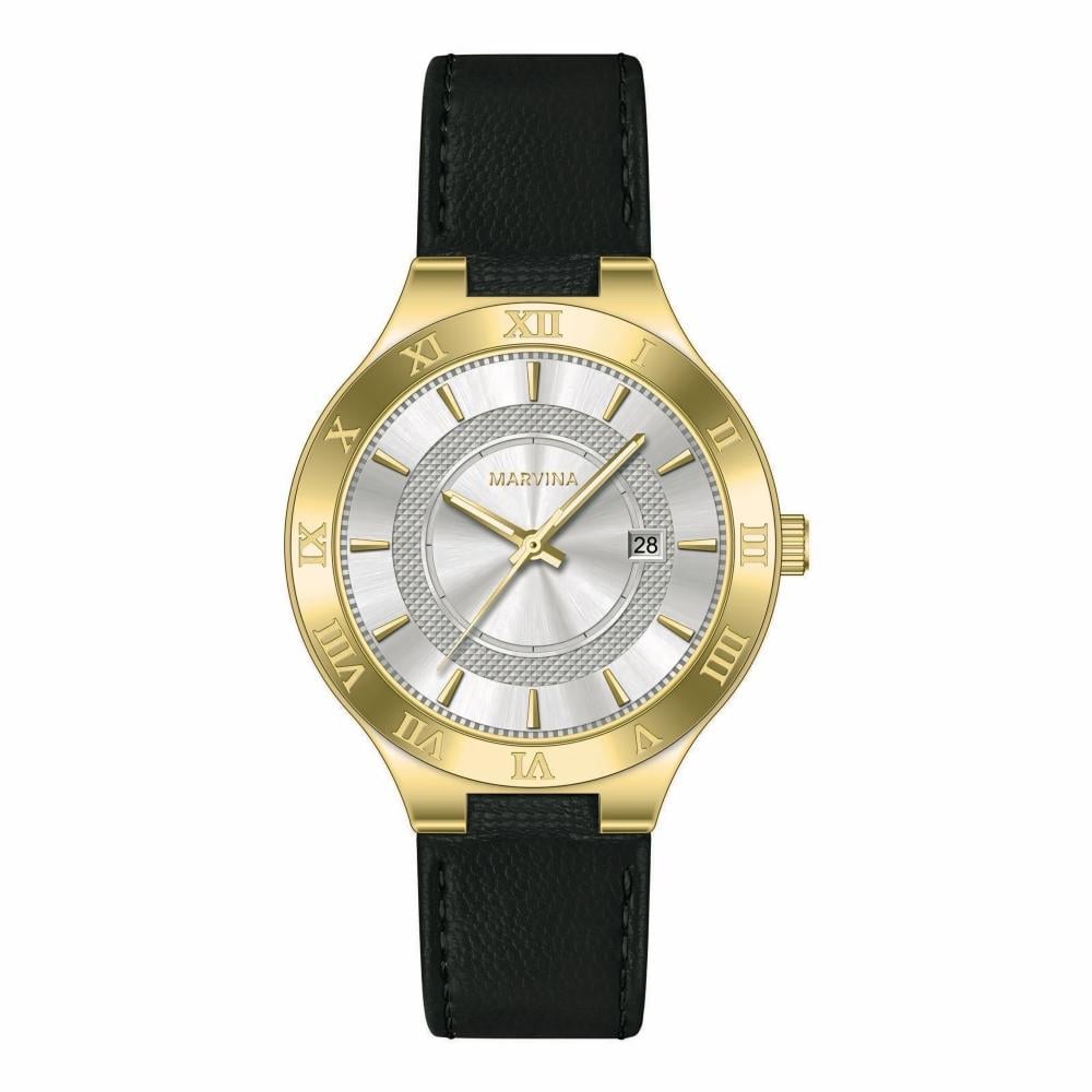 ساعة جلد رجالي من مارفينا لون اسود مع ميناء فضي
