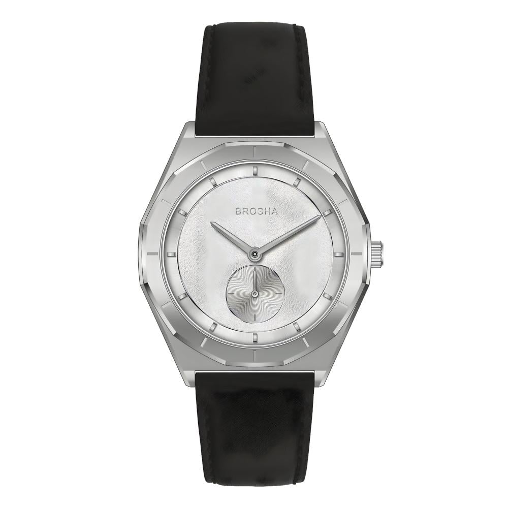 ساعة رجالية أنيقة من BROSHA بتصميم معدني لامع يجسد الأناقة الكلاسيكية مع لمسة من الحداثة.، مع مؤشرات معدنية دقيقة تضفي عليها طابعاً بسيطاً ومتميزاً. السوار مصنوع من الجلد الأسود الفاخر، مما يضمن راحة ومرونة في الاستخدام اليومي