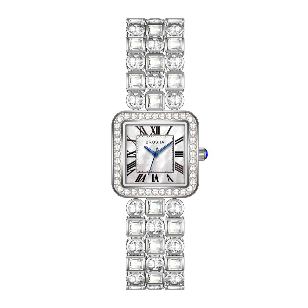 "تألقي بلمسة من الأناقة والفخامة مع ساعة بروشا المربعة المتألقة. تتميز هذه الساعة بتصميمها الفريد بسوار مرصع بأحجار كريمة لامعة يعكس الضوء من كل زاوية. وجه الساعة المربع الأبيض الناصع يضفي لمسة من الكلاسيكية