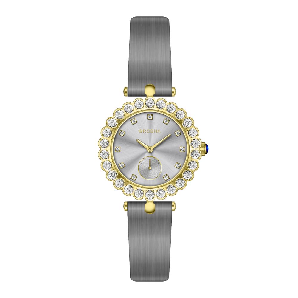 ساعه بروشا نسائي جلد رمادي ذهبي