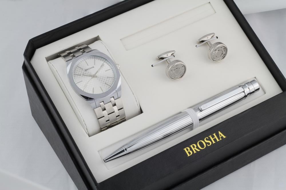 - ساعة يد: ساعة أنيقة ذات تصميم كلاسيكي وعصري في نفس الوقت. تتميز بحزام معدني فضي وإطار دائري.