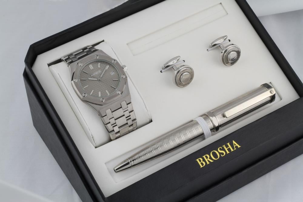 هدية أنيقة ومميزة محكمة التغليف في صندوق أسود فاخر. تحتوي الهدية على مجموعة من القطع التي يمكن أن تكون مناسبة لرجل أعمال أو لشخص يقدر الأشياء الراقية. تتضمن المجموعة: